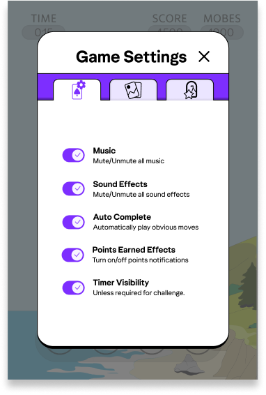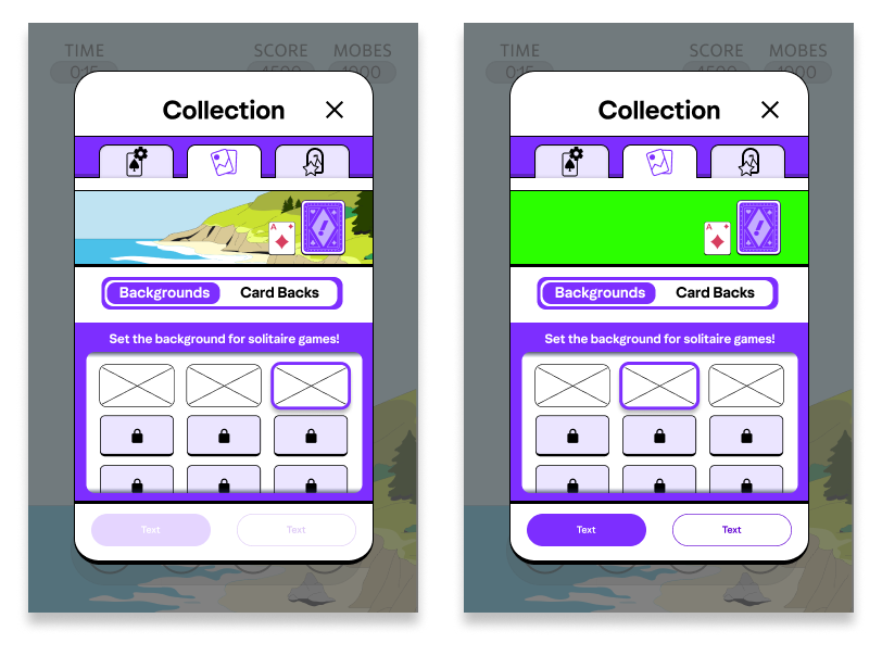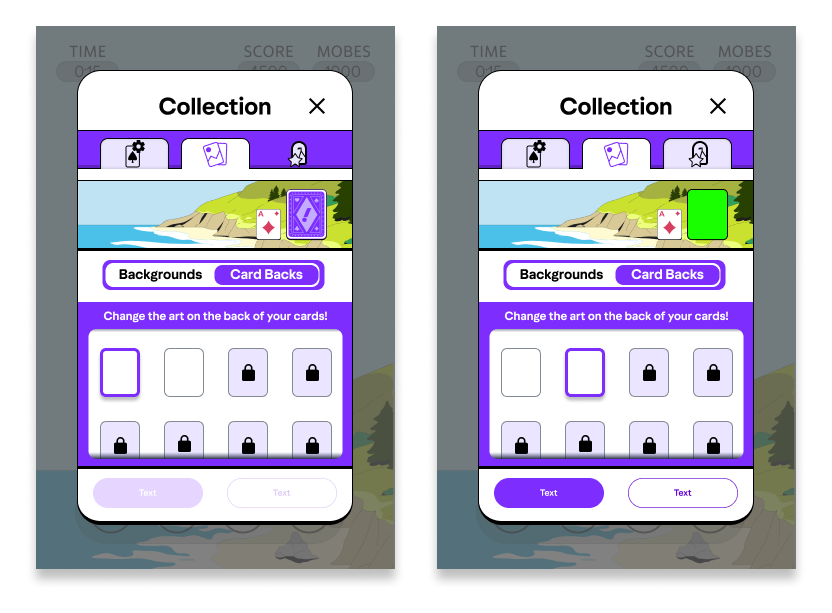 The customizations tab houses all of the players collectibles that could adjust their play experience. Specifically the player can change the background of their solitaire games and the backs of the cards they are using. I thought it was important for players to see the relationship between the backgrounds and the cards before they “applied” the changes, so I added a preview area the player could see the outcome of their change. The visualization of the Backgrounds and card backs toggle was a backlog design. The final version in game did not have the time to clean this up at the time of writing this case study.