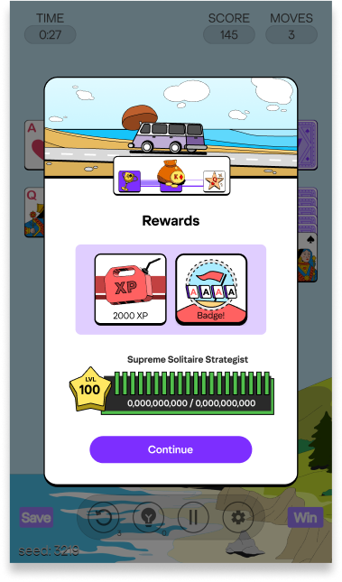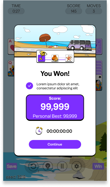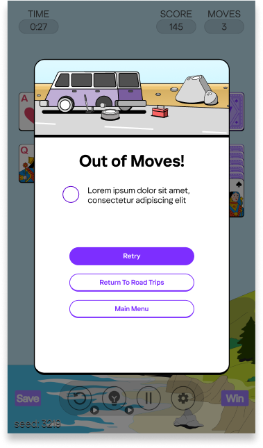 Another version of that third screen in the flow was also pitched to have a FTUE moment for certain content. Especially needed after the first game of solitaire. The player needs encouragement or instructions that the Road trip mode exists.