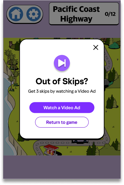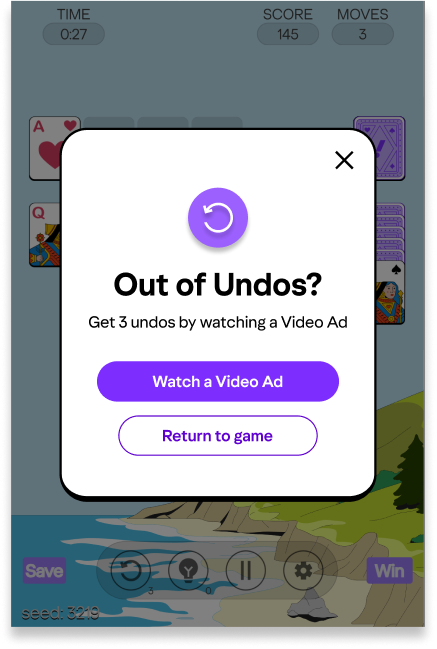 A video ad modal that pops up in a couple different scenarios when the player needs Hints, Undos and Skips. The game provides them with a base level of hints, Undos and Skips, then they can watch an ad to get more.