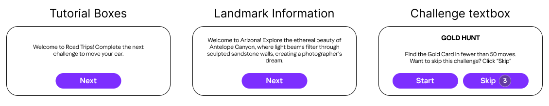 Road trip menu was designed near the end of development and there were quite a few limitations. The elements I designed were around how the messages were displayed when players went from one challenge to another. I also defined how settings, home and the title of the route shows on this screen on both screen sizes.