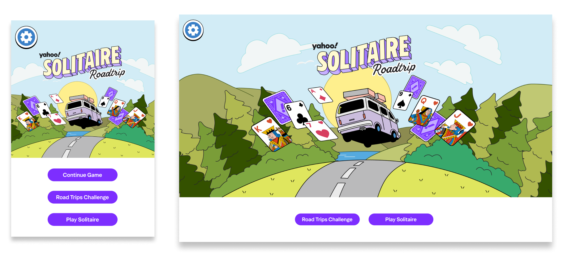 The Main Menu was initially made to accommodate 3 buttons. Two main buttons Road Trips challenge (the main focus of this game) and Play Solitaire. Continue Game button appears if the player started a solitaire game or challenge but did not finish it. Also, this established having settings on the top left of the screen for one other screen in the game so it would always be available no matter where they are in the game and it would always be in the same place.